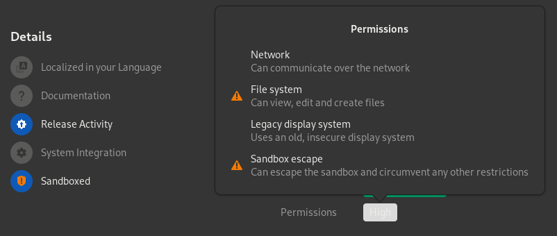 And, indeed, users are still mislead by the reassuring blue "sandboxed" icon. Two years is not enough to add a warning that an application is not sandboxed if it comes with dangerous permissions (like full access to your home directory)? Seriously?